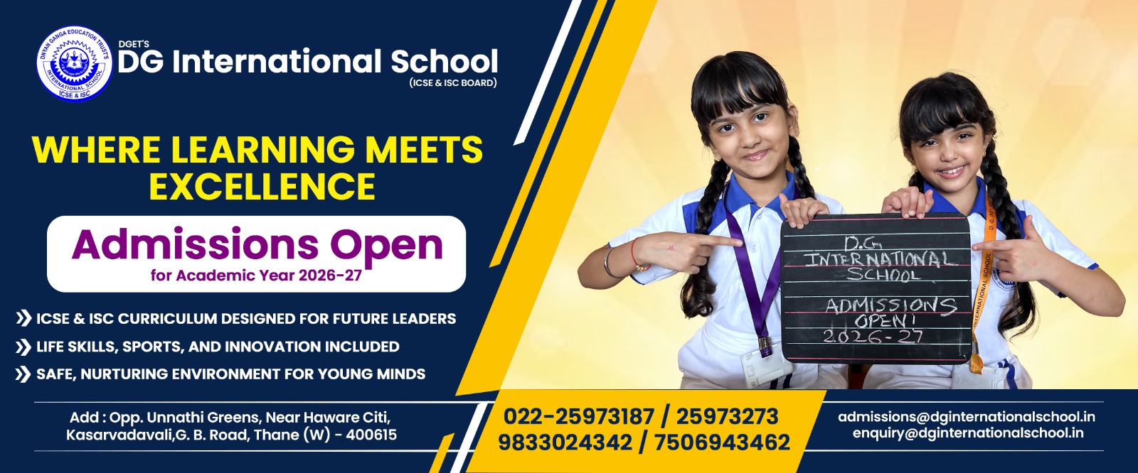 Dg International School is an educational hub delivering quality education from KG to PG in Thane. To meet with global standards of growing academic challenges, is determined to run the institutions professionally, adopting modern advancements in academics and technology to shape the individuals into truly global citizens with Indian values. DG aims at creating professionally superior and ethically strong global manpower into leaders and managers of tomorrow.